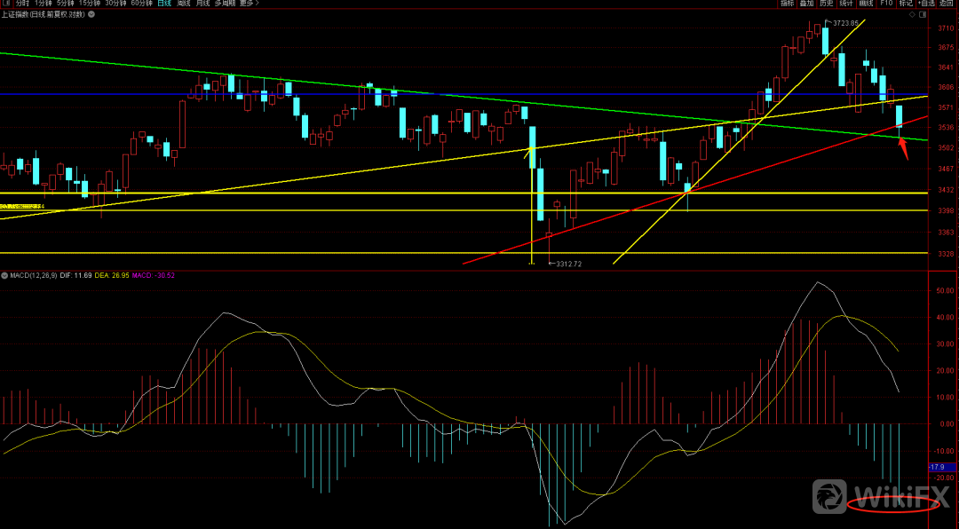 沪深300第三次出现跌破上升趋势线,由于macd量柱出现扩张,周四大概率会出现再次向下探周三的低点,关注是否会出现探底回升的走势,如果想要不跌破上升趋势线需要国庆后回来要出现大幅拉升才能避免。
