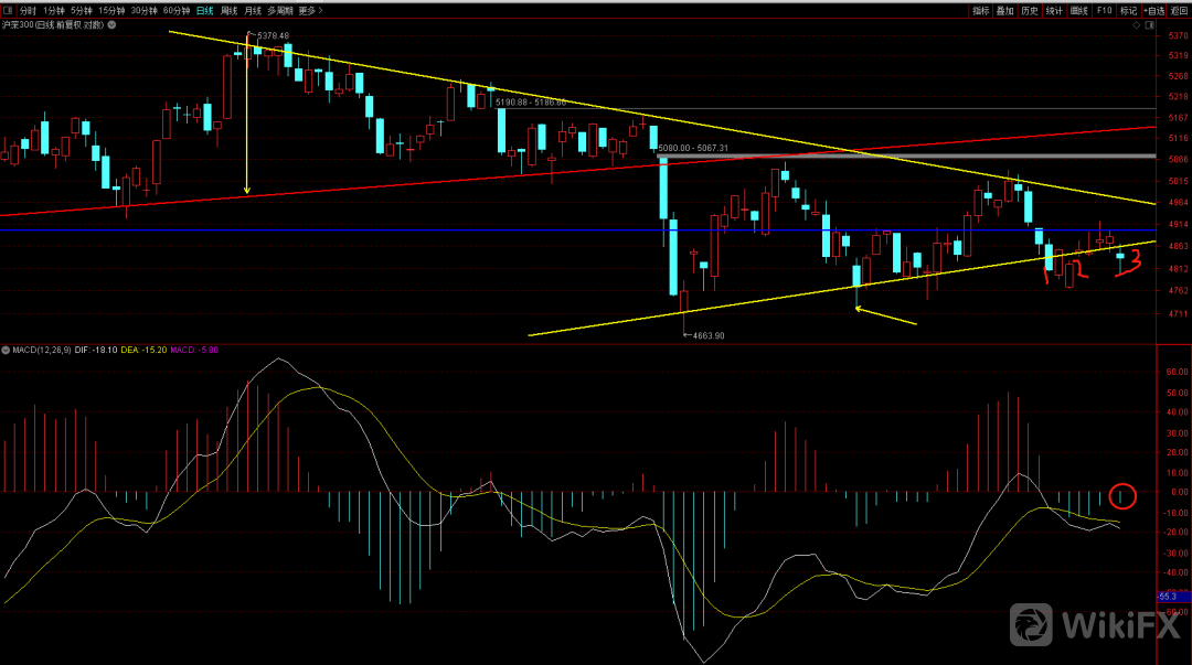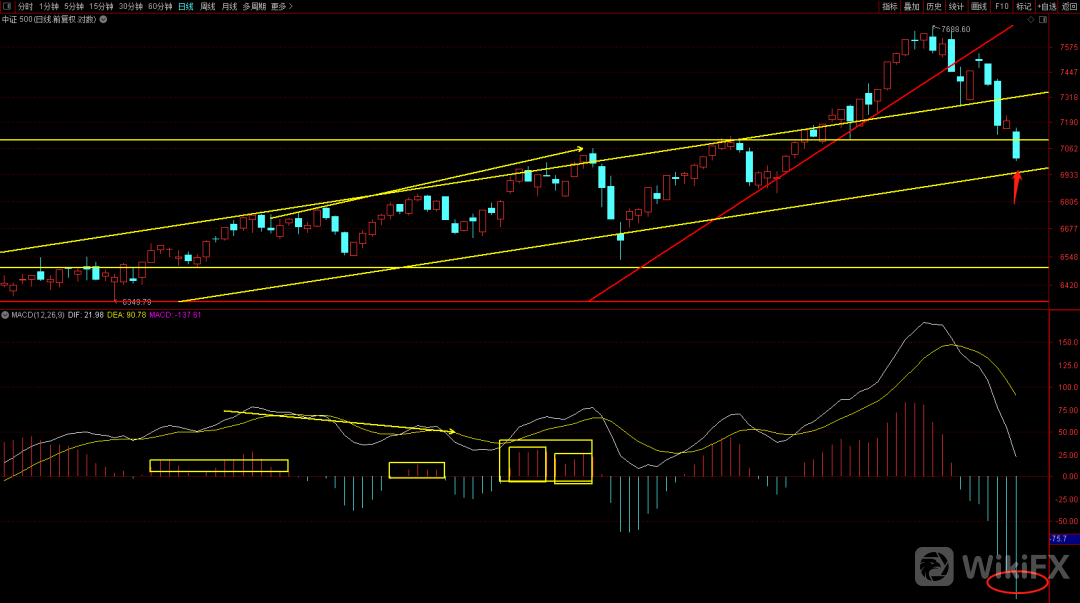 中证500跳空低开后向着前期上升趋势轨道下轨移动,短期大概率会再次向下,但下跌空间相对有限,这个位置大概率会出现一个反抽走势。关注后续反抽的力度如果不足够强则可能再次出现回落。