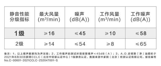 1级静音认证是按以下吸油烟机静音性能分级指标对产品进行认证,A.O.史密斯「瀞」油烟机的各项测试结果均符合1级静音的要求。