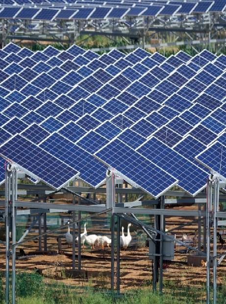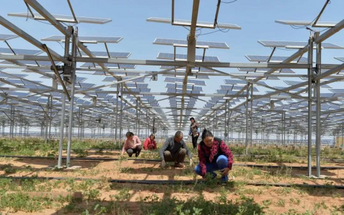 2.工业治沙。利用粉煤灰等工业废渣,就地取材沙漠中的沙子,研发国际上技术领先的石油压裂支撑剂等产品。利用生物、生态技术,将工业废渣和农作物秸秆腐熟等发展为土壤改良剂、复混肥、有机肥料等。利用沙漠日照的光热资源,创新“板上发电、板间种草、板下养殖”的立体经济模式,实施光伏发电项目。利用光伏电池板遮风遮阴,促进植物的生长,为散养的羊和鸡提供庇护,禽畜的粪便提供了有机肥料,改良了土壤,使土地得到了修复。