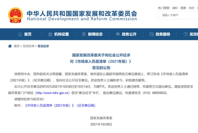 10月8日,国家发改委就《市场准入负面清单(2021年版)》向社会公开征求意见。征求意见稿提到,禁止违规开展新闻传媒相关业务。