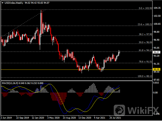 周线图显示美元指数震荡上行,当前持续测试94.15阻力。从MACD来看,快慢线向上运行,白色动能柱温和增量。指数走势基本和动能柱的变化一致。
