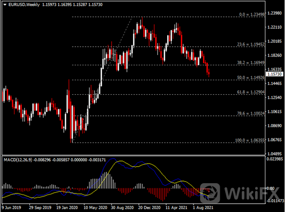 周线图显示欧元兑美元震荡下挫,当前承压于1.1695阻力。 从MACD来看,快慢线向下运行,红色动能柱温和放量。汇价走势基本和动能柱的变化一致。
