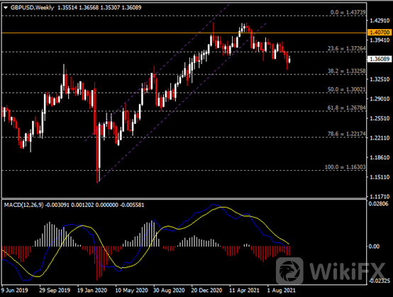 周线图显示英镑兑美元终结4周连跌,当前仍承压于1.3730阻力。 从MACD来看,快慢线向下运行,红色动能柱则温和收缩。汇价走势基本和动能柱的变化一致。