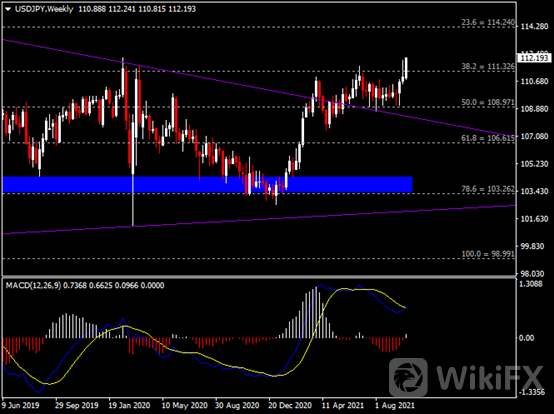 周线图显示美元兑日元震荡走强,当前收于前高111.30。从MACD来看,快慢线形成金叉,红色动能柱收缩殆尽。汇价走势基本和动能柱的变化一致。