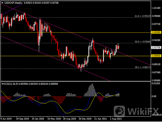 周线图显示美元兑瑞郎小幅收低,当前仍承压于0.9365阻力。 从MACD来看, 快慢线向上运行,白色动能柱略呈收缩。汇价走势基本和动能柱的变化一致。