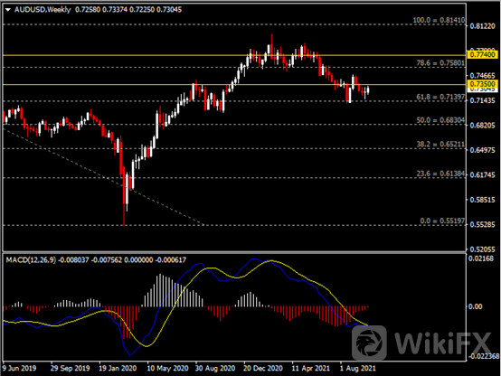 周线图显示澳元兑美元反弹上涨,当前回测0.7350阻力。 从MACD来看,快慢线欲形成金叉,红色动能柱温和收缩。汇价走势基本和动能柱的变化一致。