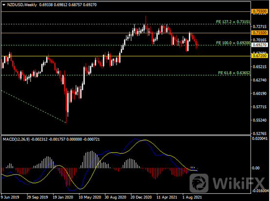 周线图显示纽元兑美元录得5周连跌,当前测试0.6920支撑。从MACD来看,快慢线形成死叉,白色动能柱收缩殆尽。汇价走势基本和动能柱的变化一致。