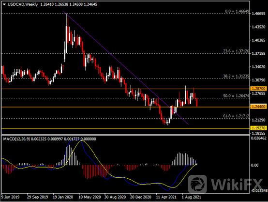 周线图显示美元兑加元震荡下挫,当前测试1.2440区间支撑。从MACD来看,快慢线逐渐收窄,白色动能柱温和收缩。汇价走势基本和动能柱的变化一致。