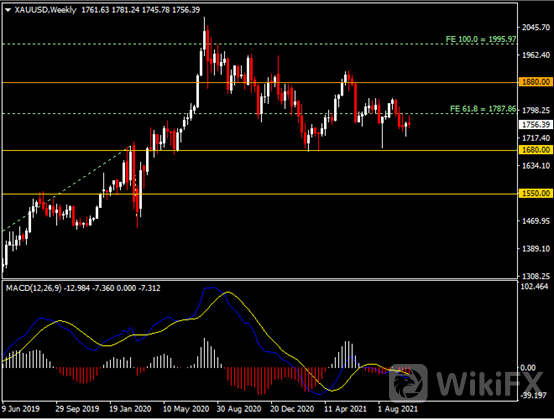 周线图显示金价小幅回落,当前承压于1790阻力。从MACD来看,快慢线向下运行,红色动能柱温和增量。金价走势基本和动能柱的变化一致。