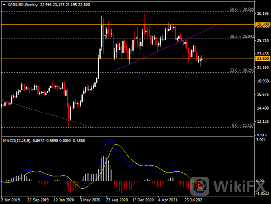 周线图显示银价跌势暂缓,当前持续测试22.60区间阻力。从MACD来看,快慢线向下运行,红色动能柱则温和收敛。银价走势基本和动能柱的变化一致。