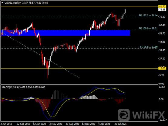 周线图显示油价扩大涨势,当前逼近81.70阻力。从MACD来看,快慢线向下运行,红色动能柱收缩殆尽。油价走势基本和动能柱的变化一致。