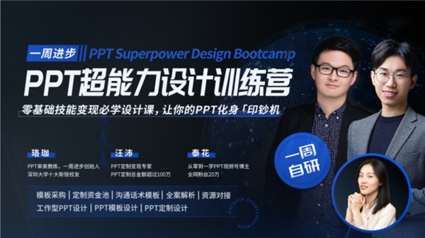 如今,一周进步的PPT相关学习课程,覆盖了从初级入门到大师级,也从简单的PPT使用技巧、套路,扩展到设计审美的提升与技能变现的深层讲解。而且一周进步的课程,也从office扩展到PS、AI设计、PR剪辑以及Python等当下流行的课程领域。