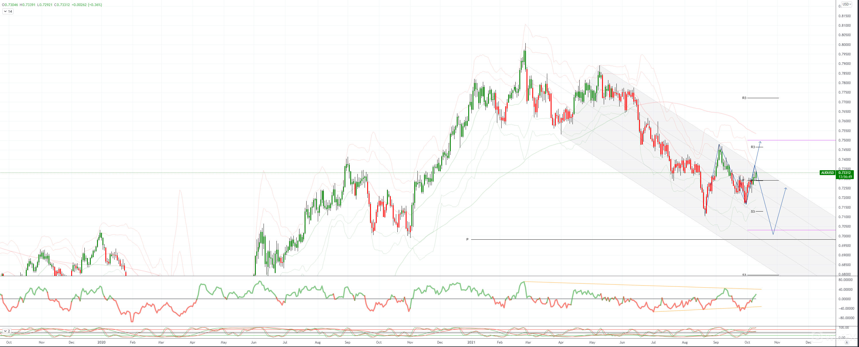 支撑位在 21 日均线 0.7277 和 10 日均线 0.7267