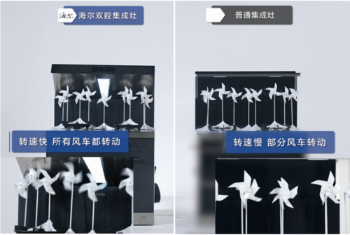 在风车测试吸速视频中,工作人员在海尔双腔集成灶与普通集成灶相同位置放置风车。打开集成灶高档模式后,海尔双腔集成灶上所有位置的风车均快速转动;而普通集成灶上的风车转速慢,还有部分位置风车不转。