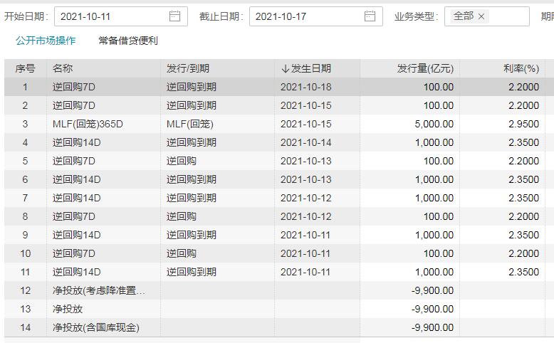 Wind数据显示,10月11日-10月17日,本周累计有5100亿元逆回购到期,此外,10月15日有5000亿MLF回笼。