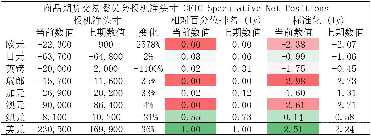 CFTC资金流数据显示,澳元、瑞郎空头处于极值,因此,预计短期随着资金流入并支持其回涨,另外,美元多头也处于极值。