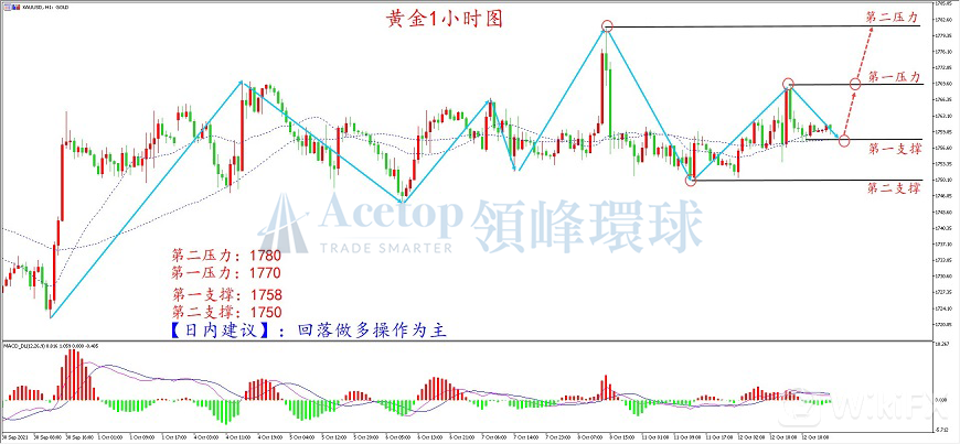 从黄金1小时周期图来看,金价多次测试1750.0支撑未果,自本周以来,高低点逐步抬高,且MA20/60均线金叉向上发散,表明行情呈现多头走势,上方关注1770.0的高点压力,上破后进一步看涨至1780.0前高压力的概率增大,下方关注1758.0的MA60均线支撑,下破后或再度向下测试1750.0支撑;从MACD指标上看,DIFF、DEA处于零轴上方,空头动能柱逐步缩短,可以等待DIFF、DEA再度金叉,日内可以采取回落做多操作为主。