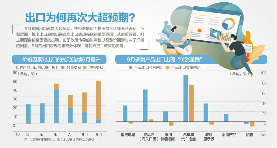 中信证券研报则指出,9月的出口表现尚未充分体现“能耗双控”政策的影响,后续应重点关注电子设备制造、纺织、化工等行业的出口表现。量价角度看,部分商品出口数量有升有降,但涨价效应显著,对于未来出口表现的预测仍需结合具体产品量价以及宏观经济等多因素分析。