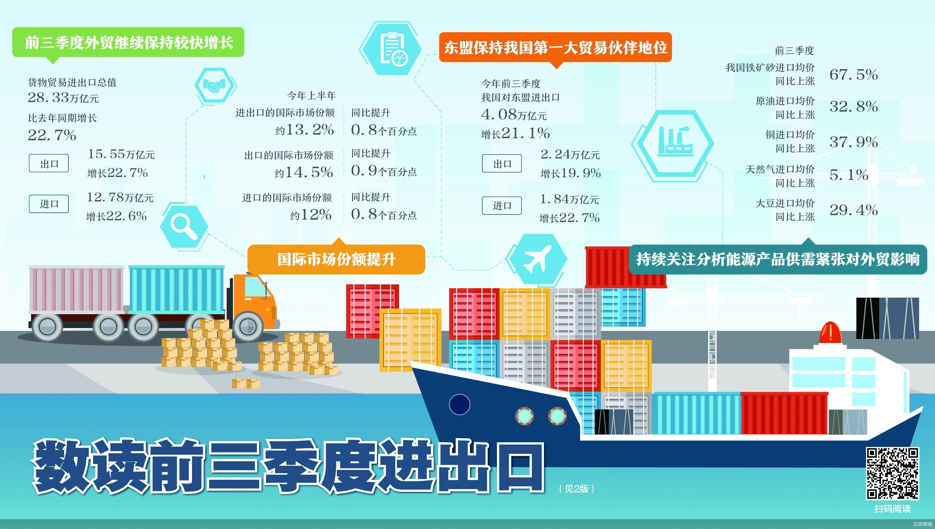 今年我国经济持续恢复发展,外贸进出口也继续保持较快增长。在10月13日国新办举行的发布会上,海关总署相关负责人介绍,前三季度我国外贸进出口韧性较足、稳中提质,货物贸易进出口总值28.33万亿元,比去年同期增长22.7%。其中,出口15.55万亿元,增长22.7%;进口12.78万亿元,增长22.6%。在出口增长动能较足、进口规模创历史同期新高的同时,我国也面临部分大宗商品进口量减价扬等问题。在2020年外贸高基数影响下,今年四季度进出口形势迎考,全年成绩能否交出令人满意的答卷?
