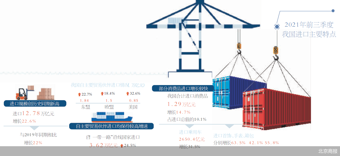 进口方面,前三季度我国进口规模创历史同期新高。据海关统计,前三季度,我国进口12.78万亿元,增长22.6%,与2019年同期相比增长22%。“我国强大的国内市场为创造全球总需求作出了贡献。”李魁文说。