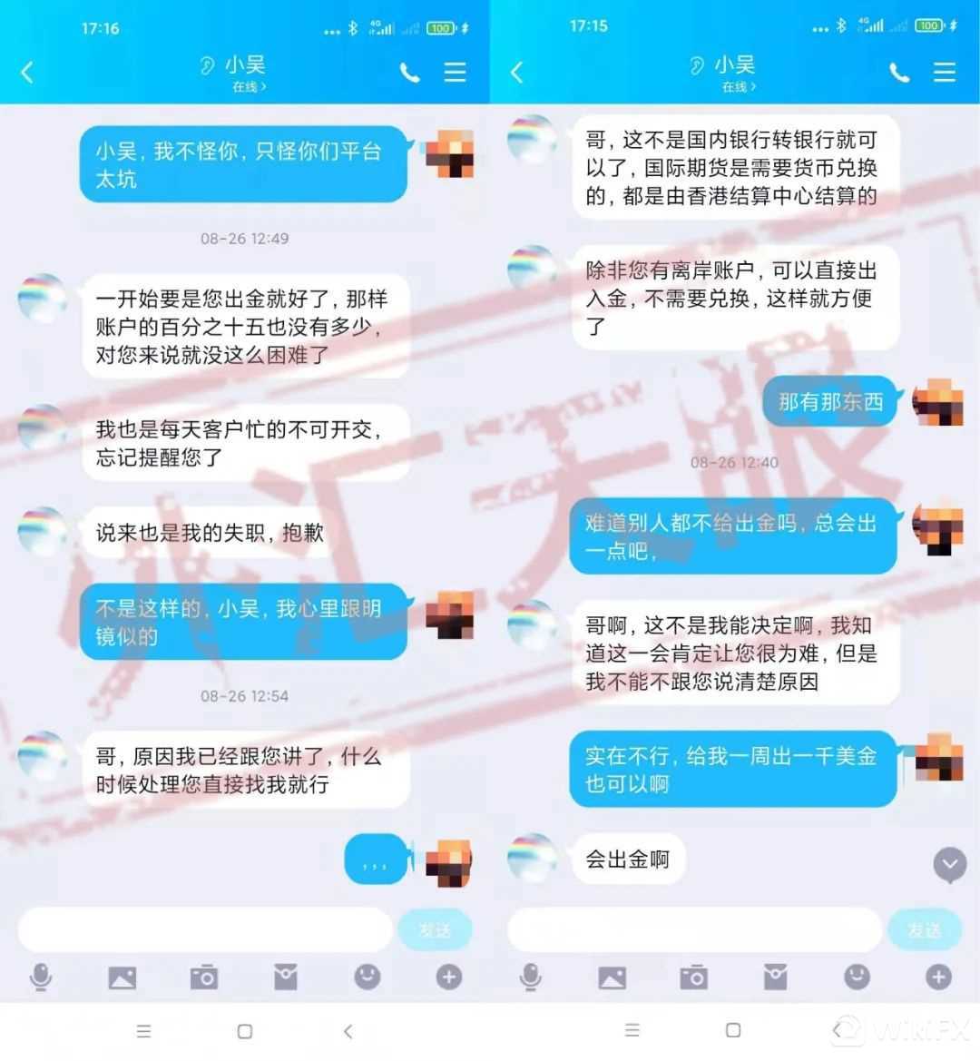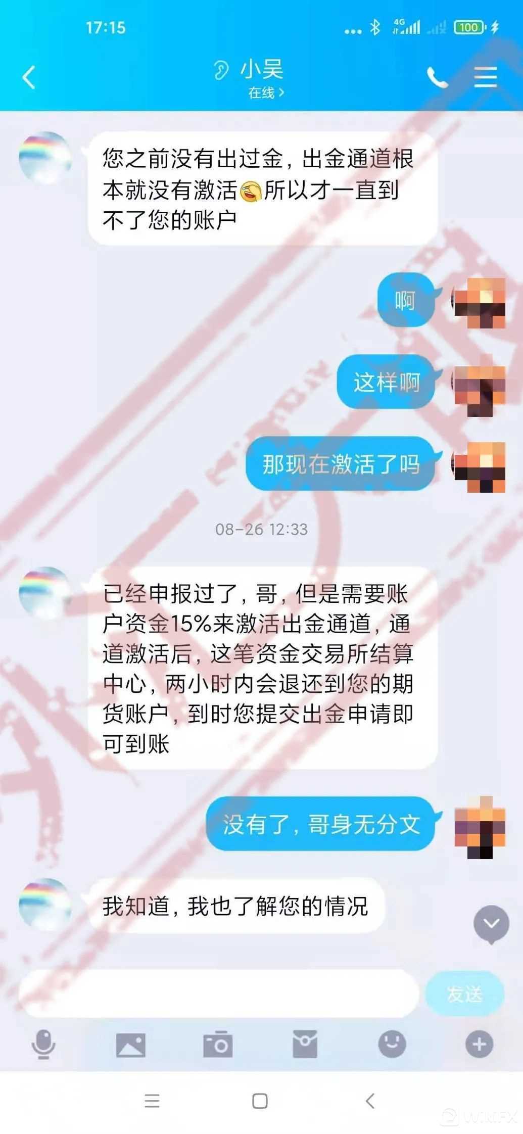 怀着对平台和老师的信任,杨先生悠哉的等到了协议终止的时间,然而自己第一次申请出金却没有成功。怀着疑惑的杨先生找到了业务员,业务员甚是惭愧的告知杨先生没有及时开通出金通道的权限,所以提现的金额一直没有到账,唯一挽救的方法就是提交账户余额15%的资金来激活出金通道。