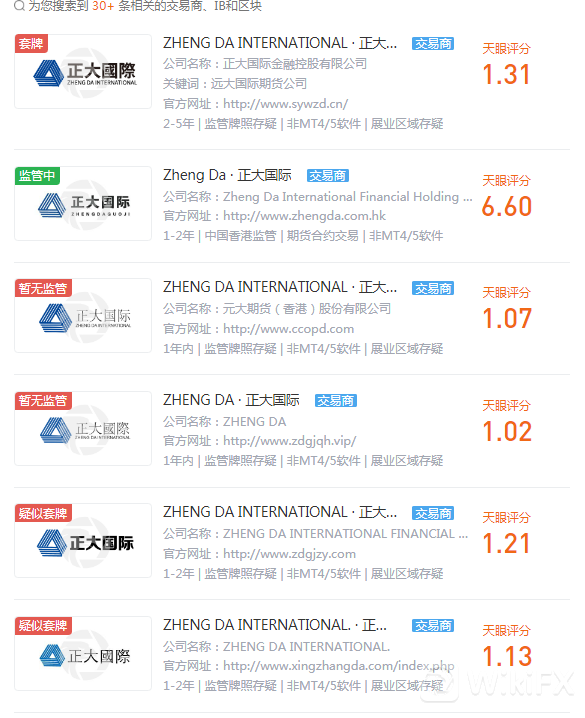 在外汇天眼上查询正大国际,一下子就出现了30+相关的交易商,与正大国际同名的就达8个之多,而8个当中只有1个是正牌的!可见山寨平台真的很猖狂呀!