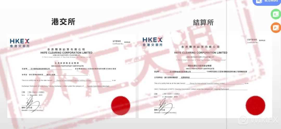 杨先生在这场骗局中,一直被“演技高超”的业务员和投资老师牵着鼻子走,再加上套用了正规的正大国际的资料背景,更是深信不疑。在杨先生提供的正大国际PPT中,不仅展示了香港SFC的监管牌照,还有港交所及结算所的相关证明,而且这些资质证明都是真实有效的,之前没有外汇投资基础的杨先生也难以分辨真假。