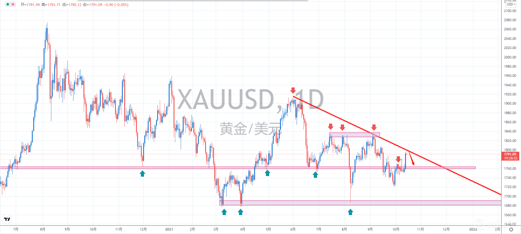 【技术点评】:D1周期,黄金保持空头趋势,当前价格测试关键阻力位。