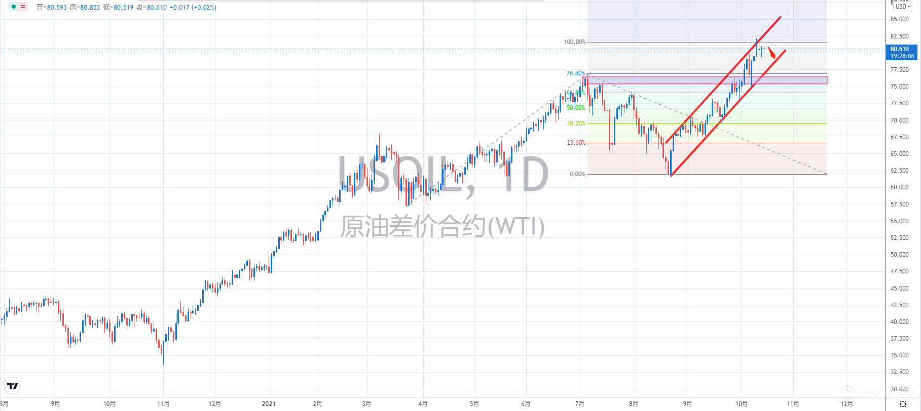 【技术点评】:D1周期,原油突破前高阻力位后稳步爬升,目前测试100%关键阻力位。