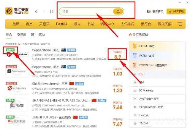 打开外汇天眼PC端后,在搜索栏输入想要查询的交易商名称,点击放大镜后就能看到所有相关的交易商,通过右上角的“监管状态”及“天眼评分”,就能基础判断交易商的可靠程度了,想要知道更多直接点击交易商的名字就可直达详情页!