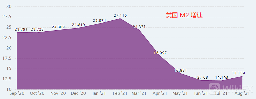 美国M2增速,自2021年2月份最高点27.116%,一路下行至8月份的13.159%,增速已经腰斩。M2提高,代表美元增多,美元指数就要贬值。反之,M2降低,美元指数自然也要升值。从图中可以看出6/7/8月份的M2增速降幅已经趋缓,这也是十年期美债收益率在这段时间出现回调的原因。我们需要密切关注9月份的M2增速数据,如果出现快速下降,则美元指数还将加速上涨。