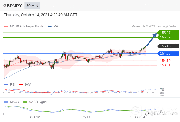 RSI技术指标在70之上,则可以认为有持续向上的趋势,或者处在一种超买的状态下,需要进行技术上的调整。我们可以通过比较RSI技术指标和价位之间的变化趋势,来观察是否在两者间存在技术背离现象。MACD技术指标处在其信号线之上看多。此外,价位高于其20天及50天移动平均线(分别位于154.80和154.68)。最后,价位突破其布林线通道上轨(位于155.08)。