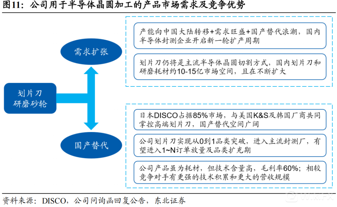 公司划片刀实现从0到1品类突破,成为主流封测厂供应商,主要对华天科技、长电科技、通富微电、日月光、中芯国际下属子公司供应,毛利率达60%。得益于公司强大的技术积累和国产替代浪潮,公司产品有望进入1~N订单放量及品类扩充期。