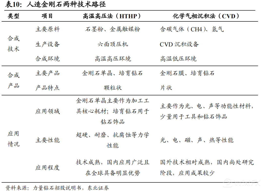 CVD法培育钻石杂质更少,其将成未来材料发展的主流,可广泛应用到如机械加工、通信、半导体、能源、国防、航空航天、军事武器等尖端领域中的关键部位。