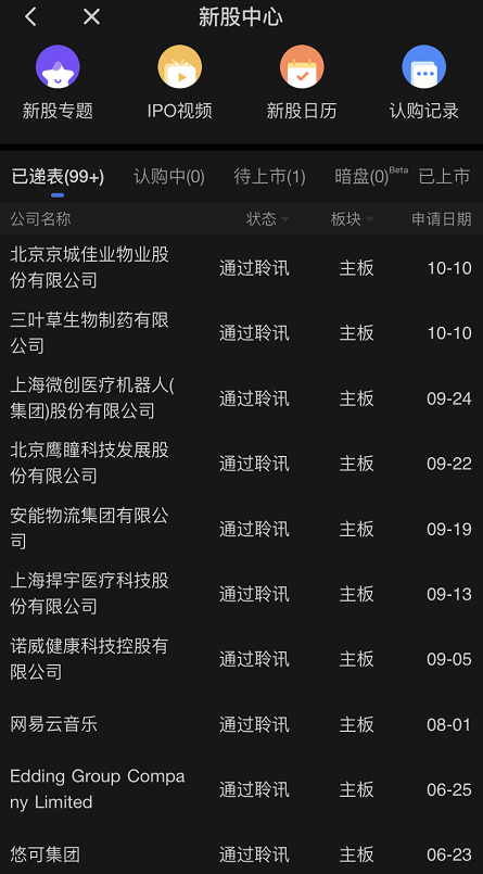 加上三叶草生物、京城佳业,目前已通过上市聆讯、但未招股状态的企业大约十家,将于近期开启招股。具体如下: