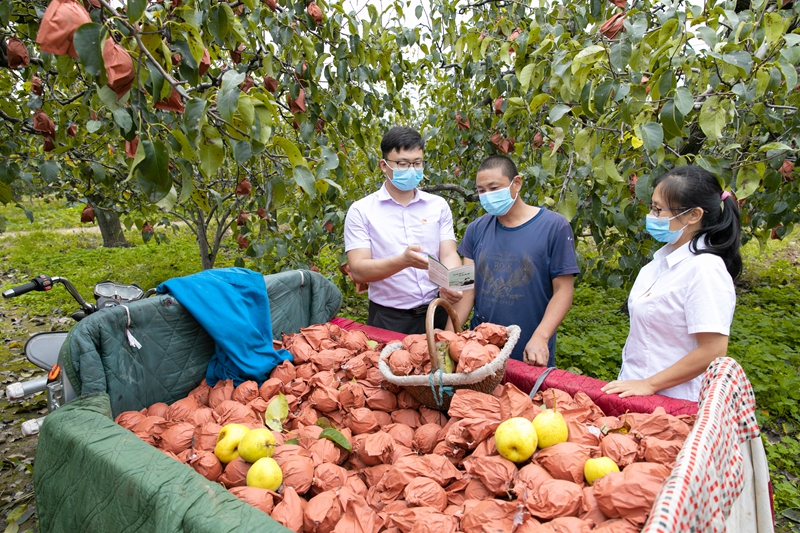 当前,正值雪花梨收获旺季,农行河北邢台分行将金融服务延伸到果园,客户经理上门了解果农收成并宣讲惠农产品,提供金融服务。据了解,近年来,该行立足县域资源,紧紧围绕“三农”新型农业经营主体金融需求,发挥“惠农e贷”产品优势,有效解决农村地区融资难题,持续提升乡村振兴金融服务效能。截至目前,该行贷款农户达8万余户,涉农贷款余额234亿元。右图为该行工作人员上门为果农办理惠农信贷业务。