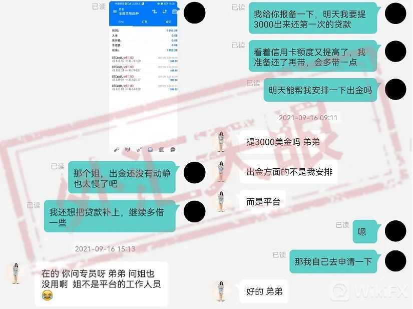 东拼西凑下的苑先生终于搞定了资金,终于可以重新跟上老师的操作步伐,但是好景不长,期间苑先生想要提现部分资金用于信用卡还款,这时的助理开始甩锅表示自己不负责出金,需要联系平台的客服。