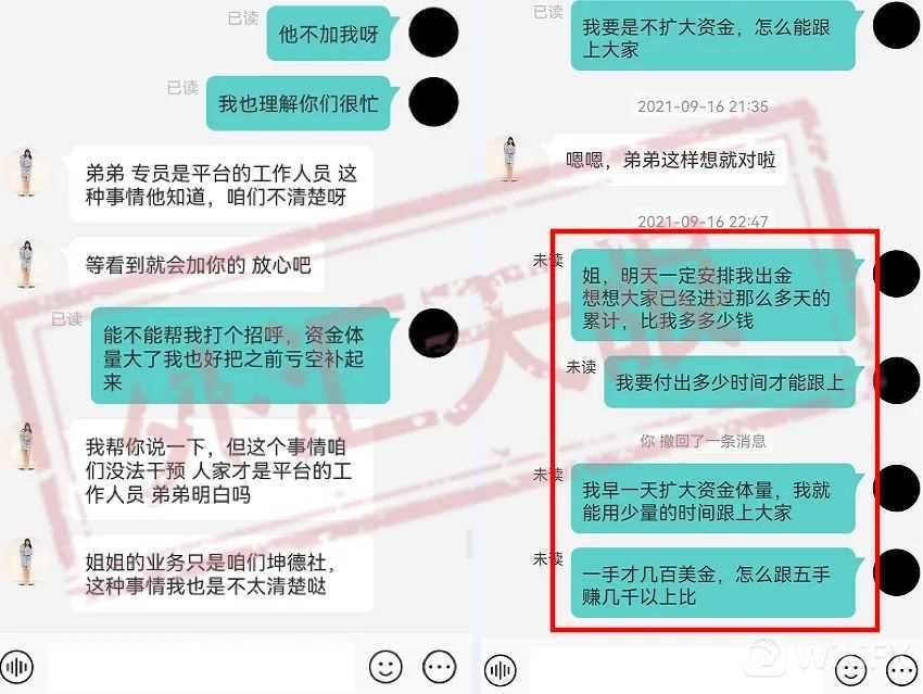 在本次骗局中,仔细推敲就会发现坤德社一直都在鼓吹不断入金,就算苑先生表示自己已经没有资金且羞耻于向家人借钱,骗子竟然以过来人的口气鼓励其去向家人张嘴要钱,这样的骗子哪里还有什么道德底线。