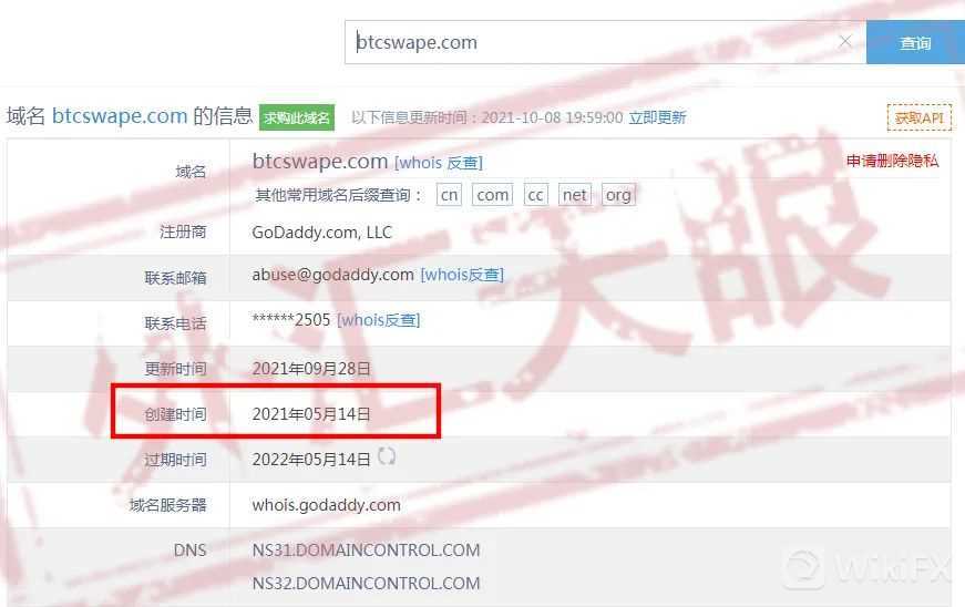 根据网站地址查询到的信息,BTCSWAP官方网站创建于2021年的5月14日,距离现在也就5个月的时间,所以查询网站的创建时间尤为重要,一个创建几个月的网站根本就是临时搭建出来的,哪有什么资质可信!