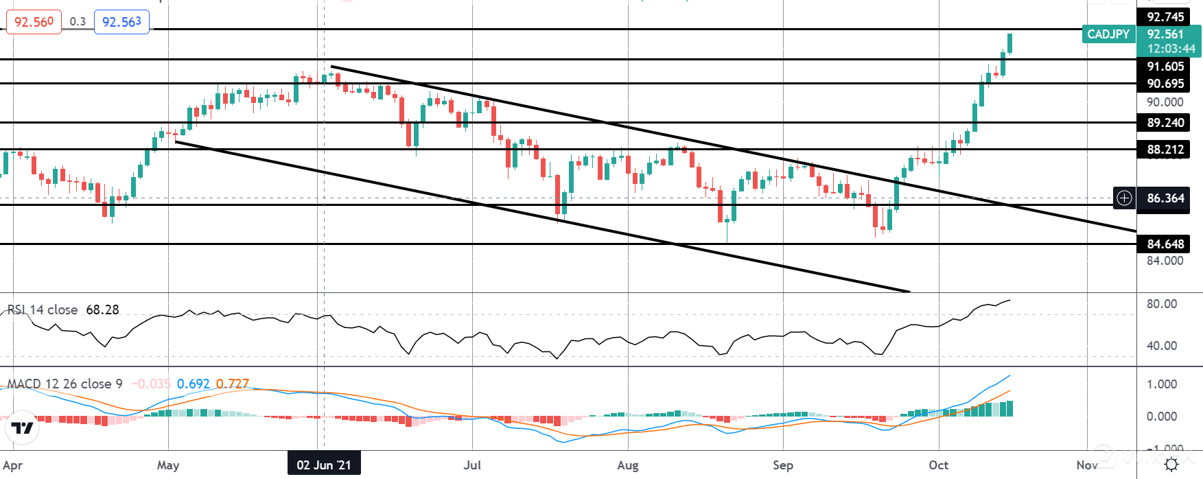 虽然加元一直处于稳固的上升轨道,但日元却面临压力。日元走强以及大宗商品价格上涨,导致日元因避险资产减少而走弱。随着日本央行重申其在市场上维持宽松政策的承诺,中国央行和日本央行之间货币政策前景的分歧意味着加元兑日元在短期内有很大的上涨空间。美元的涨势比加元对日元的冲击要大得多,因为加元的支撑来自石油涨势。考虑到这一点,任何因美联储退出政策而导致的美元进一步上涨都可能进一步推动加元兑日元走高。所以,这是基本背景,现在让我们看一下技术图。