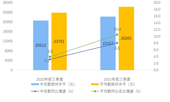 前三季度,全国居民人均可支配收入中位数22157元,增长8.0%,中位数是平均数的84.4%。其中,城镇居民人均可支配收入中位数32417元,增长8.0%,中位数是平均数的90.2%;农村居民人均可支配收入中位数11962元,增长12.3%,中位数是平均数的87.1%。