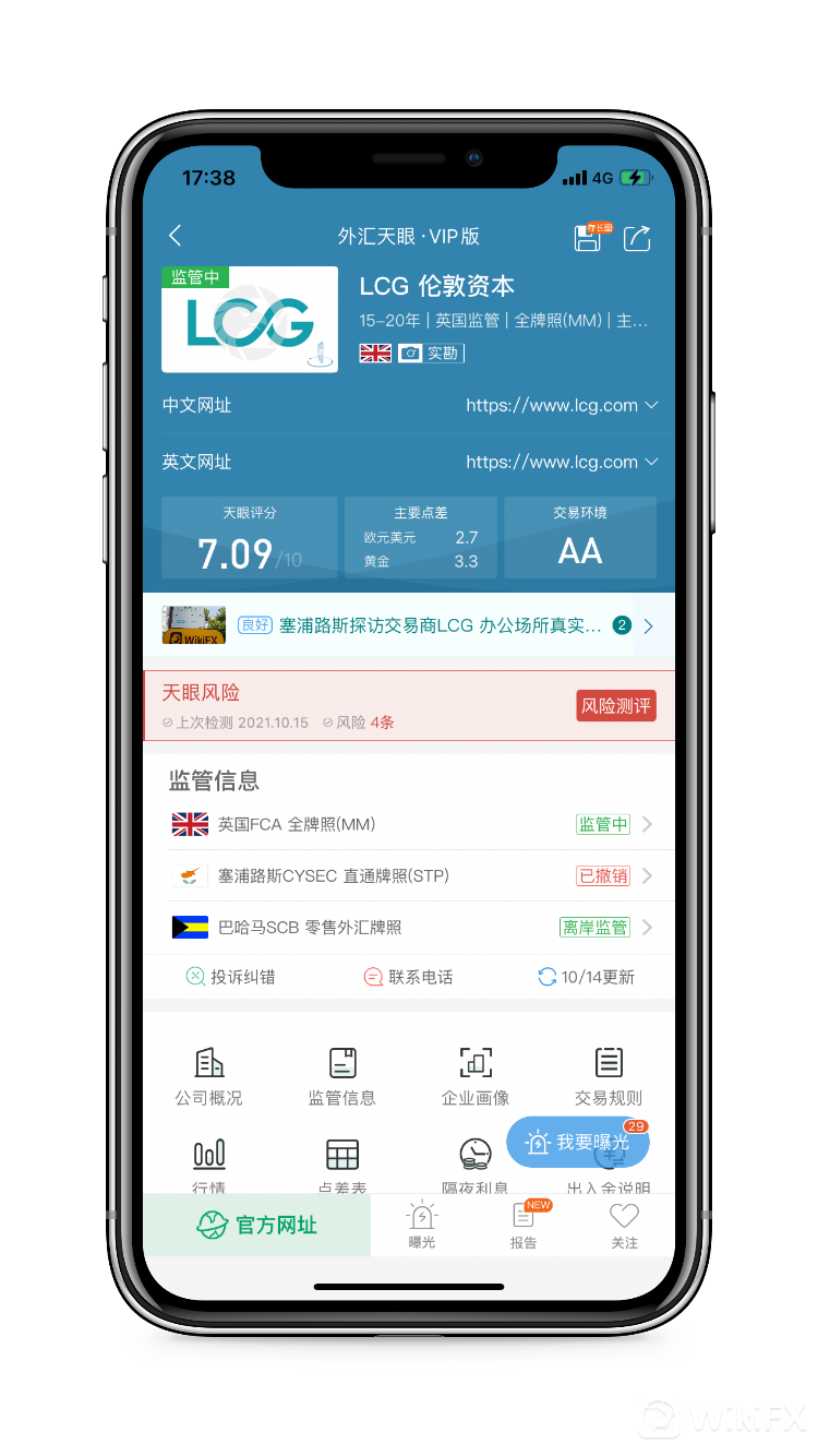 LCG伦敦资本,天眼评分7.09分,其宣称持有的牌照被撤销后,尚有正在监管中的英国FCA全牌照和巴哈马SCB零售外汇牌照,在其曝光台中出现了高达29条的客诉信息,但是绝大部分为假冒LCG的所作所为,建议投资者在投资时一定要学会分辨平台,鉴于塞浦路斯CYSCE的直通牌照的撤销,望投资者注意警惕!