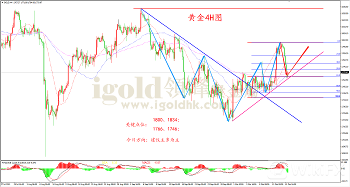 值得注意的是,经济增速遭下调,通胀风险引发市场担忧。供应链瓶颈、价格压力和世界公共卫生事件带来的风险仍在上升。国际货币基金组织表示,其对2021年全球经济增长的预期为5.9%,而此前的预期为6%。由于供应紧张,美国2021年的经济增长预期从7%下调至6%。最新数据进一步加剧了人们对经济增长的担忧,显示通胀回到13年来的高点,目前来看通胀不会是暂时的,全球央行将无力在不损害经济的情况下遏制价格飙升,这对黄金有一定的支撑作用。不过黄金想要再度上涨,还需要有足够的上涨动能让黄金突破关键技术压力位,否则金价将很难反弹。