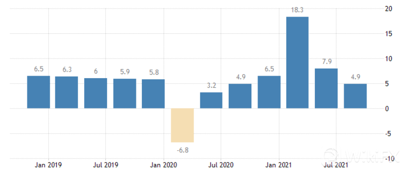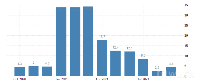 2021年9月中国零售贸易同比增长4.4%,前一个月增长2.5%,超出市场预期的3.3%,原因是部分地区疫情得到控制后消费增强。期内, 家具(3.4% 对6.7%)和建筑材料(13.3% 对13.5%)均录得轻微。其他项目如珠宝(8 月20.1% 对7.4%)、化妆品(3.9% 对平读数)、个人护理(0.5% 对-0.2%)、电信(22.8% 对-14.9%)、家用电器(6.6% 对-5.0%)、。相比之下,服装(-4.8% 对-6%)和汽车(-11.8% 对-7.4%)的销售额均下降。