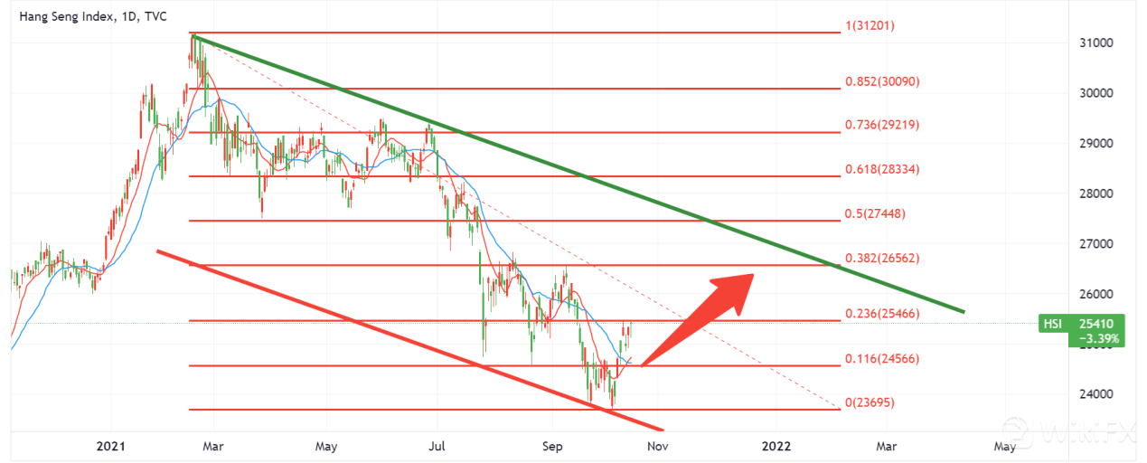 ATFX分析恒生指数走势认为,恒生指数料于10天和20天线之上继续上升发展。短期内若恒生指数突破25466点将上望26562点(如下图), 但留意, 若恒生指数低于10天和20天线, 走势可能转弱至23695点。假如最后在该点出现支撑并反弹, 双底形态确认后, 后市有望突破26562点, 继续上探27448点。