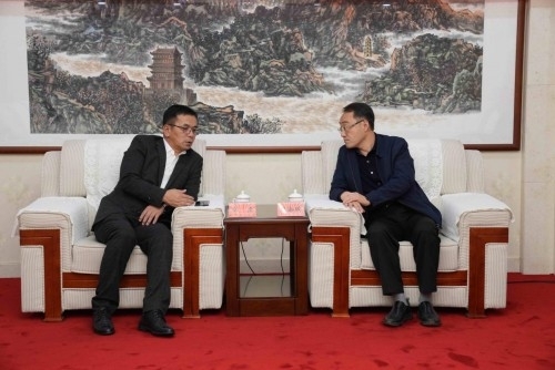 图:运城市副市长刁海鹏(右)、辛选公益负责人辛库(左)参加座谈会和捐赠仪式