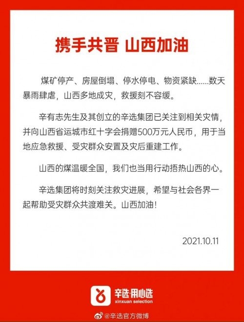 10月11日,辛选集团创始人辛有志关注到山西灾情后,第一时间向山西省运城市红十字会捐款500万元人民币,用于当地应急救援、受灾群众安置及灾后重建工作。辛选方面称,“山西的煤温暖全国,我们也当用行动捂热山西的心。”