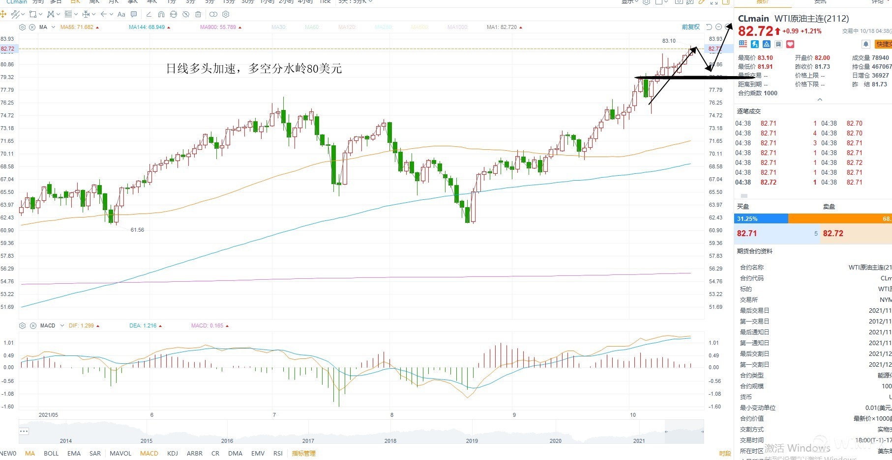 美原油周线八连阳,创近七年新高,基本面上供需错配为原油提供了支撑,而天然气价格上涨,短期供应紧俏,提振了原油的需求预期,从EIA数据来看,供给端继续下降,推动油价走强,当然美债收益率的传导也有一定的助推作用,继续观察供需方面的变化,值得留意的是目前价格已经偏高,但维持在加速通道之中向上,等待趋势结束的信号,日线方面来看80美元成为短期多空分水岭,若回踩跌破80美元则上涨告一段落,不排除调整的可能性,回踩不破则维持强势多头