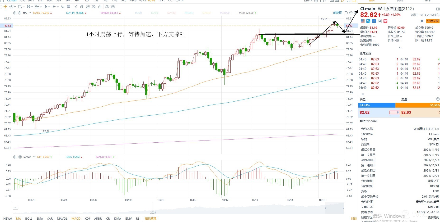 4小时级别来看目前维持在上行通道之中,均线多头排列,本周需要关注EIA库存数据的变化,日内支撑81美元不破,维持上涨结构,上方的空间取决于多头的情绪,等待加速